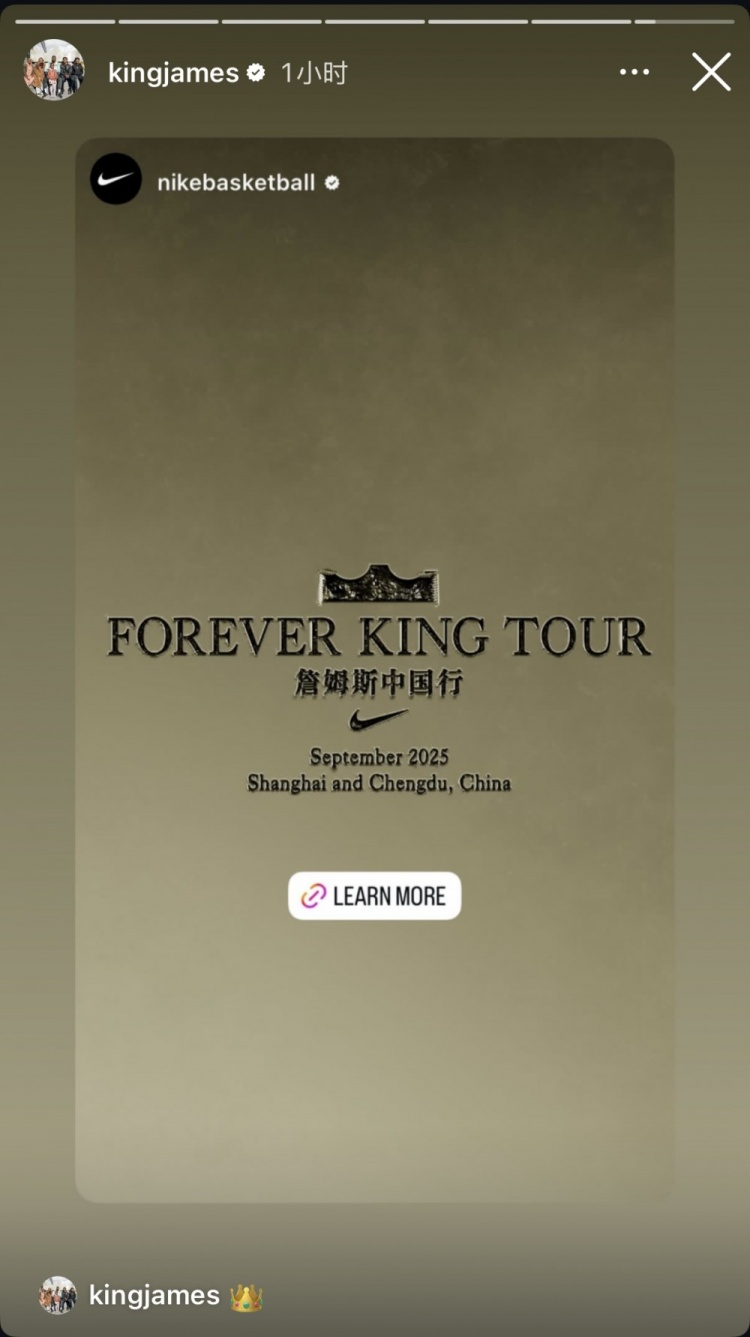 詹姆斯转发了耐克篮球官方Instagram发布的詹姆斯2025年中国行的官宣动态,并评论了👑的表情。