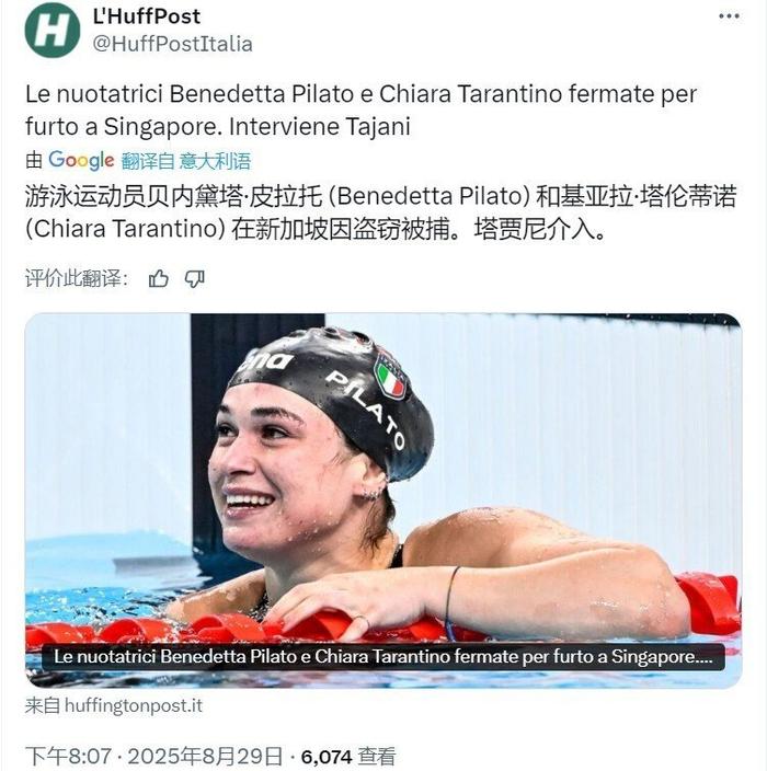 8月30日消息,据多家意大利媒体的报道,意大利游泳选手贝内德塔-皮拉托和队友塔兰蒂诺因为在新加坡涉嫌入店行窃,遭到了当地警方的拘留。在意大利外交部和当地大使馆的介入下,两人在几小时后被释放并返回意大利。